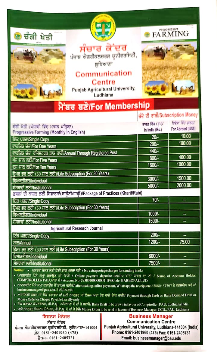 The Communication Centre, Punjab Agricultural University (PAU), Ludhiana invites individuals and institutions to subscribe to its range of agricultural publications, including Progressive Farming (monthly magazine), Package of Practices, and Agricultural Research Journal.